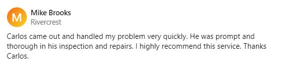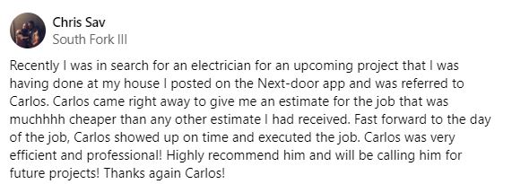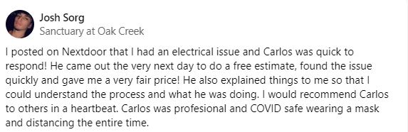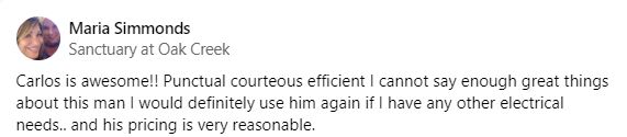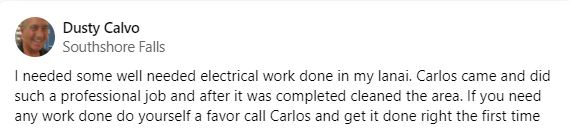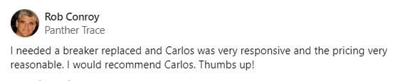 I had a home for sale, it went thru inspection. There was a double tap found in the electrical fuse box. I called Carlos he was super professional & courteous he schedule an appointment with me. He came out the next day assessed the problem replace what need to be done. I highly recommend Carlos he’s a true professional.