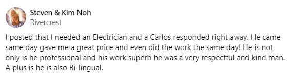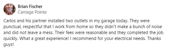 We have used Carlos for electrical services and also use them bi-monthly for cleaning services… They are FANTASTIC! I would highly recommend as they are very professional and fairly priced. Can’t say enough good things about their service.